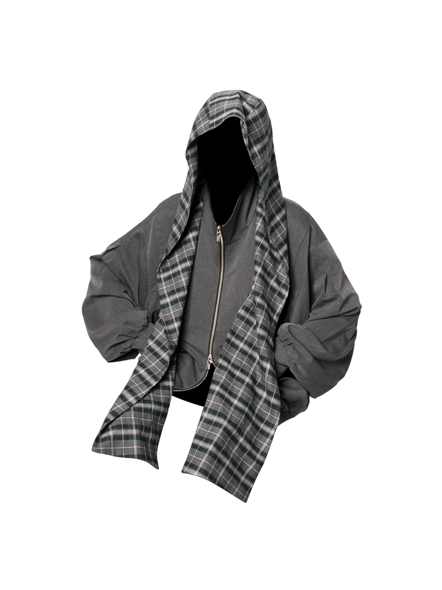 無機質なグレートーンをベースに、チェック柄のストールとフーディーが一体化したデザインが奥行きを生み出す。
